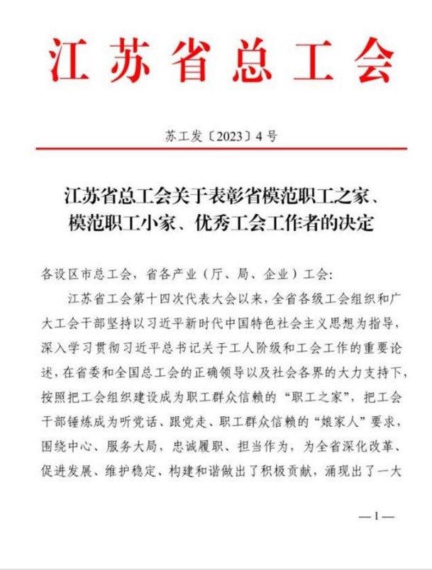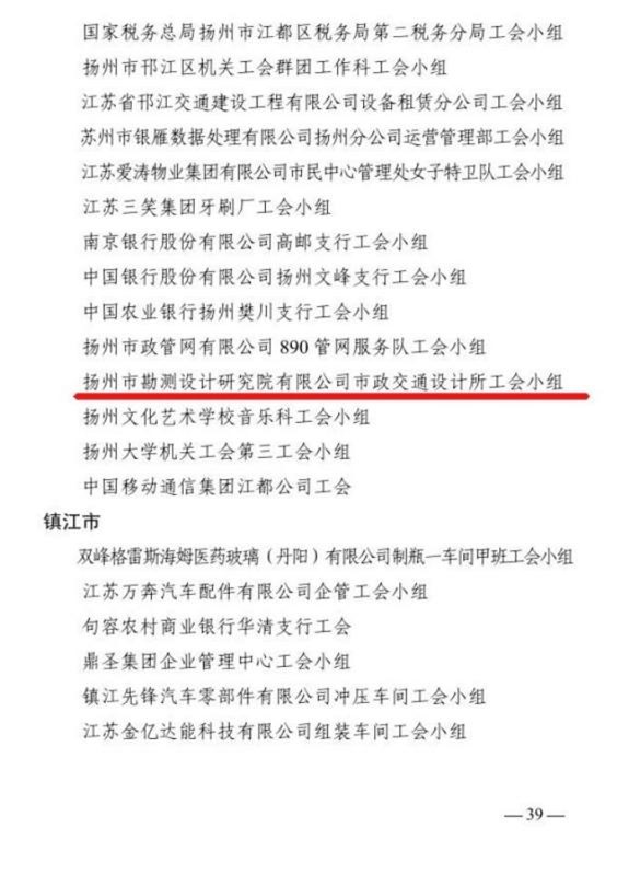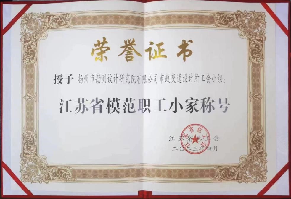 近日,江蘇省總工會印發(fā)《關(guān)于表彰江蘇省模范職工之家、模范職工小家、優(yōu)秀工會工作者的決定》,揚州市勘測設(shè)計研究院有限公司市政交通設(shè)計所工會小組被江蘇省總工會授予“江蘇省模范職工之家”稱號。